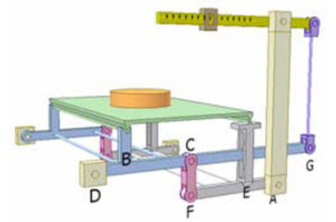 AE/AF= BD/CD Bàn cân màu lục lắp khớp quay với thanh xanh và lắp khớp trụ trượt với thanh xám. Khi thanh xám và xanh nằm ngang, thanh hồng và