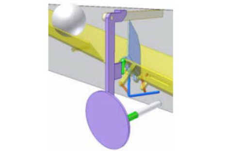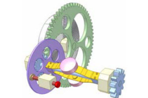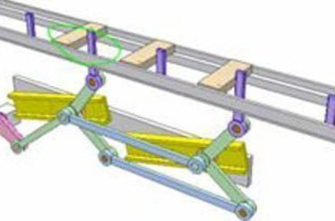 Cơ cấu vận chuyển: Khâu dẫn: tay quay hồng. Khâu tím đẩy các vật màu nâu. Đường lục là quỹ tích của một điểm trên khâu tím. Khâu lục, xanh và