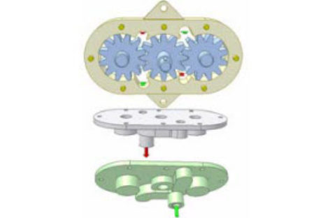 Mô phỏng cơ cấu cơ khí] Bơm 3 bánh răng răng ngoài 2. Bánh răng dẫn ở giữa, quay ngược chiều kim đồng hồ. Chất lưu giữa răng và thành