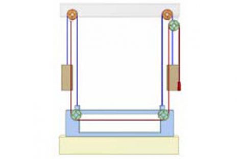[Mô phỏng cơ cấu cơ khí] Truyền động dây 9B Cơ cấu để nâng hạ sàn công tác (màu xanh). Sàn có khuynh hướng xuống vị trí thấp nhất. Dây
