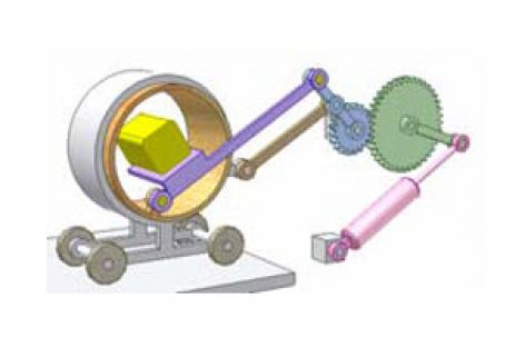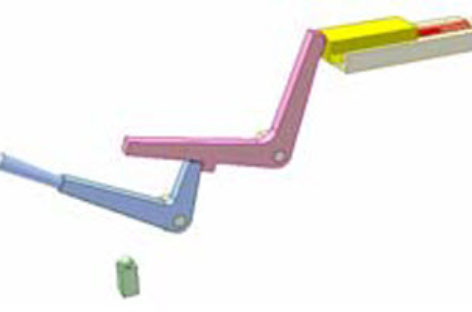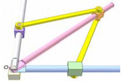 Khâu dẫn: xi lanh hồng. Tay quay xanh, thanh truyền nâu và xe màu xám tạo thành cơ cấu tay quay con trượt. Vật vàng có chuyển động phức tạp được điều