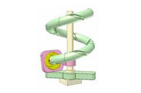 [Mô phỏng cơ cấu cơ khí] Cam xuyến xoắn Khâu dẫn màu lục quay. Bạc màu vàng mang chốt quay quanh trụịc của bạc. Con trượt hồng chuyển động dọc theo