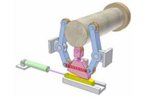 Nhờ xi lanh lục chêm vàng di chuyển con trượt hồng, hai đòn xanh để các con lăn màu cam vào tiếp xúc với phôi nâu. Phôi được đỡ trong khi cắt
