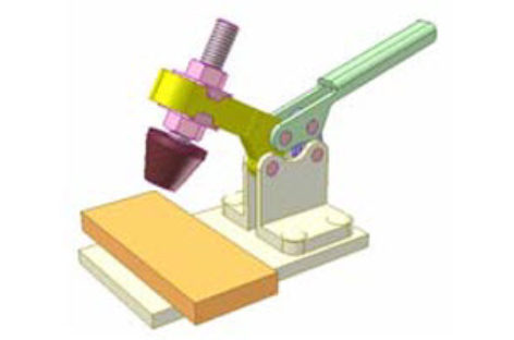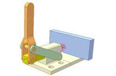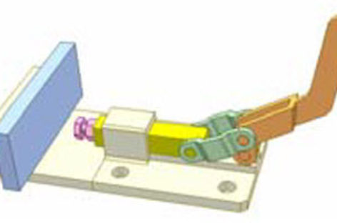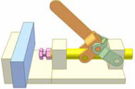 Tay quay màu cam và thanh truyền màu lục duỗi thẳng hàng lúc kẹp chặt. Lực kẹp đặt vào tay quay. Để xem các video khác về mô phỏng cơ