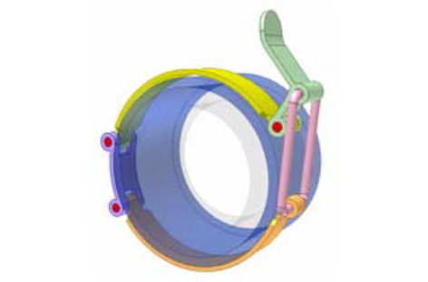 Khung màu hồng và thanh truyền màu lục chập lên nhau lúc kẹp chặt. Lực kẹp đặt vào thanh truyền. Để xem các video khác về mô phỏng cơ cấu