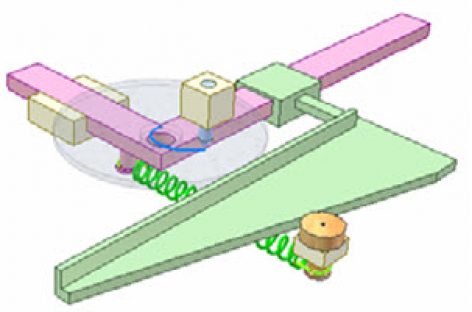 Khi chêm xanh di chuyển, bút xanh vạch trên đĩa kính đường xoắn Acsimet. Đĩa quay do ma sát với chêm (dùng bánh răng thanh răng ở đây tốt hơn). Bước của