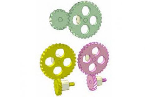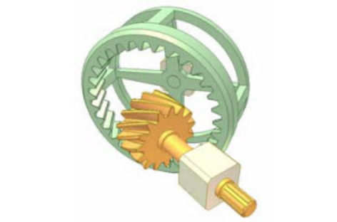 Bộ truyền gồm một bánh răng nhỏ (hồng) và một bánh răng lớm (xanh) nhưng tỷ số truyền là 1. Răng xoắn gây ra điều tưởng là vô lý này.