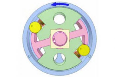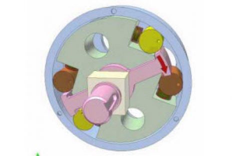 Trục màu xanh và lục quay quanh ổ cố định. Lò xo xanh và chốt đỏ duy trì sự tiếp xúc giữa các chêm vàng và hai trục. Mũi tên