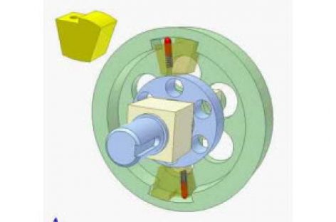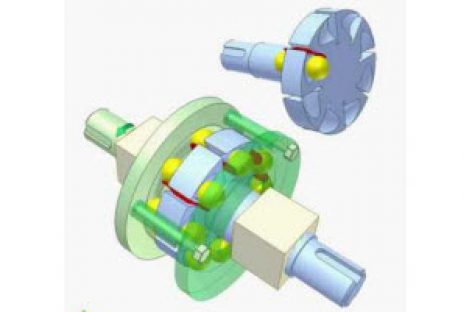 Trục màu xanh và lục quay quanh ổ cố định. Lò xo đỏ luôn ép các bi vàng vào khe chêm giữa hai trục. Mũi tên chỉ chiều quay của