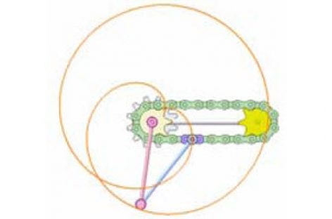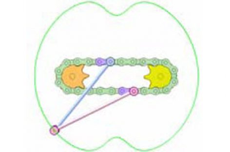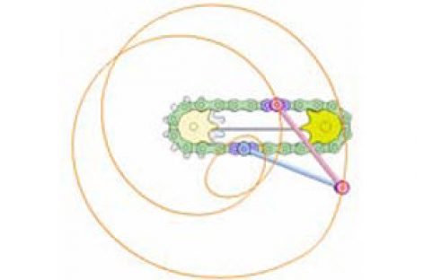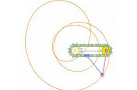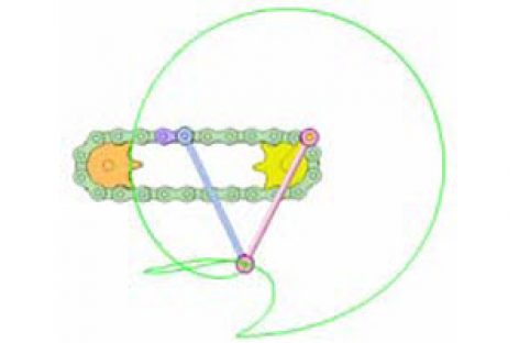 [Mô phỏng cơ cấu cơ khí] Khớp trục xích 3F Hai đĩa xích như nhau. Quỹ tích của tâm khớp quay giữa thanh hồng và xanh là đường cong phức tạp.