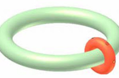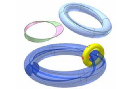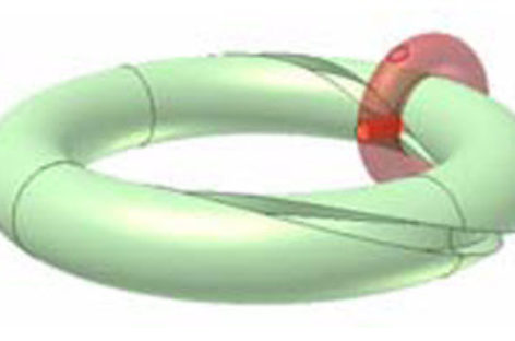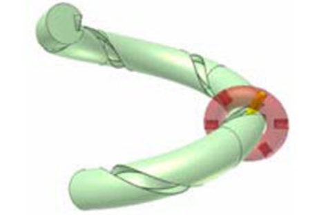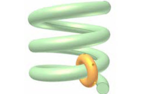 [Mô phỏng cơ cấu cơ khí] Khớp xuyến xoắn 1b Trên hình xuyến lớn màu lục có rãnh xoắn hai vòng (n = 2). Hình xuyến nhỏ màu đỏ quay