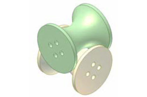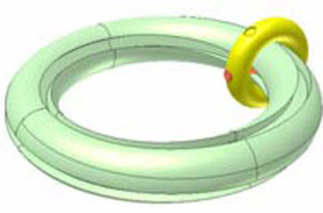 [Mô phỏng cơ cấu cơ khí] Khớp xuyến xoắn 1c Trên hình xuyến lớn màu lục có rãnh xoắn 1/3 vòng (n = 1/3). Hình xuyến nhỏ màu vàng quay