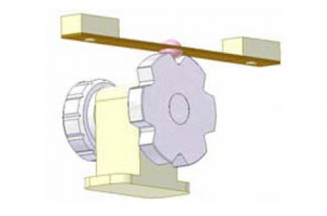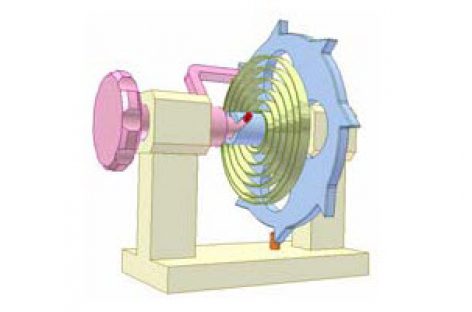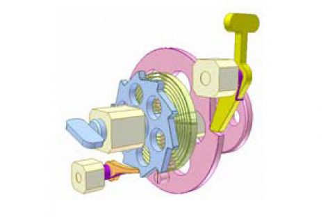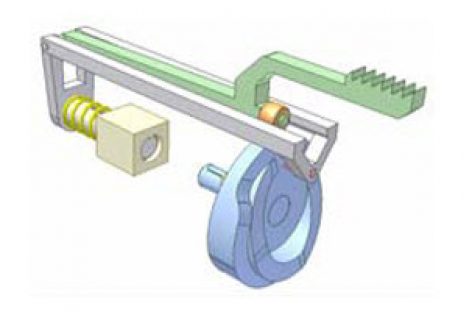 [Mô phỏng cơ cấu cơ khí] Cơ cấu phân độ 3 Khâu dẫn: bánh cóc màu hồng có 2 răng, quay 180 độ nhờ lực lò xo xoắn phẳng, mỗi khi