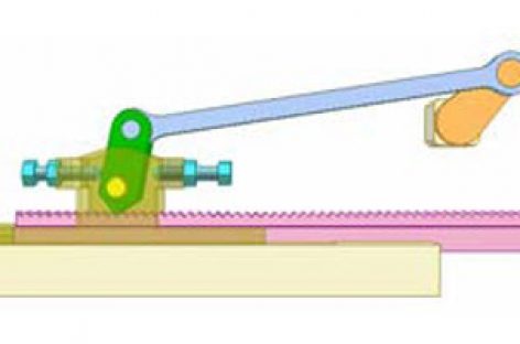 Ly hợp một chiều cho chuyển động thẳng. Con trượt vàng chuyển động đi lại nhưng thanh răng hồng chỉ đi về bên trái. Điều chỉnh vị trí các vít xanh