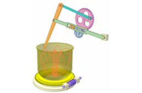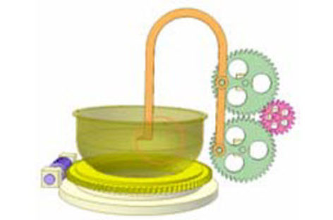Các bánh răng của máy trộn màu lục và thanh chữ U màu cam tạo thành cơ cấu bình hành. Khâu dẫn là bánh răng hồng và trục vít tím.
