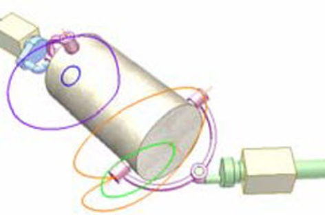 Khâu dẫn: trục xanh. Góc giữa trục xanh và trục lục: 40 độ. Thùng màu nâu chuyển động phức tạp. Đường xanh và lục là quỹ tích của tâm hai