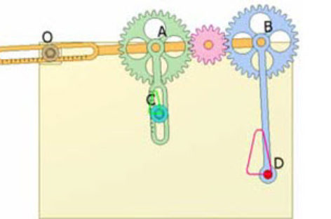 Cơ cấu thanh của pantograph thông dụng được thay bởi bộ truyền bánh răng. Bánh răng xanh và lục có cùng số răng. OCD: đường thẳng AC và BD song