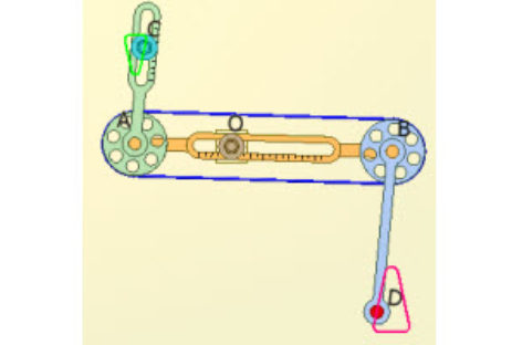 Cơ cấu thanh của pantograph thông dụng được thay bởi bộ truyền đai (đai răng thì tốt hơn). Puli xanh và lục có cùng đường kính. COD: đường thẳng AC