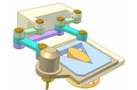 [Mô phỏng cơ cấu cơ khí] Đồ gá phay mặt trụ trong Phôi màu vàng được kẹp lên thanh truyền màu xám của cơ cấu bình hành và chuyển động tịnh