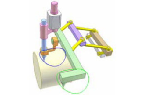 Đường xanh do một điểm trên con trượt xanh vạch ra được chép vào chỗ khác nhờ khớp màu cam và hệ 3 cơ cấu bình hành (thanh truyền lục,