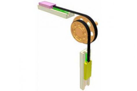 [Mô phỏng cơ cấu cơ khí] Truyền chuyển động thẳng 8 Có hai đai. Một đầu đai cố định vào puli. Khi con trượt hồng chuyển động đều, con trượt vàng