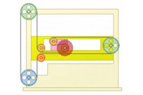 [Mô phỏng cơ cấu cơ khí] Truyền động đai 13 Truyền động giữa các trục song song, có trục di động. Trục dẫn màu hồng. Các bánh đai lớn nằm