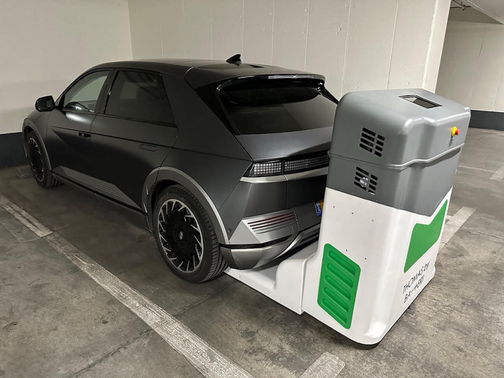 Robot Thomas hình chữ L có bánh xe ở phía dưới, cho phép nó di chuyển độc lập xung quanh bãi đậu xe và sạc xe điện theo yêu cầu.