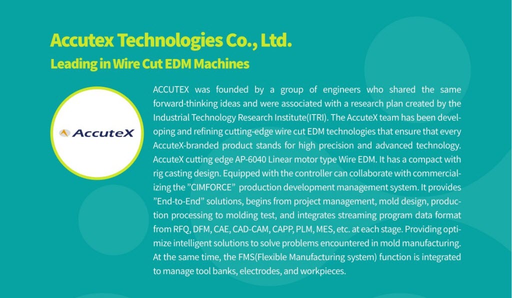 ACCUTEX được thành lập bởi một nhóm kỹ sư có chung ý tưởng tiến bộ và cùng hợp tác với nhau trong một dự án nghiên cứu được thực hiện bởi Viện Nghiên cứu Công nghệ Công nghiệp (ITRI). Đội ngũ AccuteX luôn không ngừng phát triển và cải tiến các công nghệ cắt dây EDM để đảm bảo rằng tất cả các sản phẩm mang thương hiệu AccuteX đều là những công nghệ tiên tiến và có độ chính xác cao. Ví dụ như công nghệ cắt dây EDM tuyến tính, mã số AP-6040 với thiết kế nhỏ gọn.