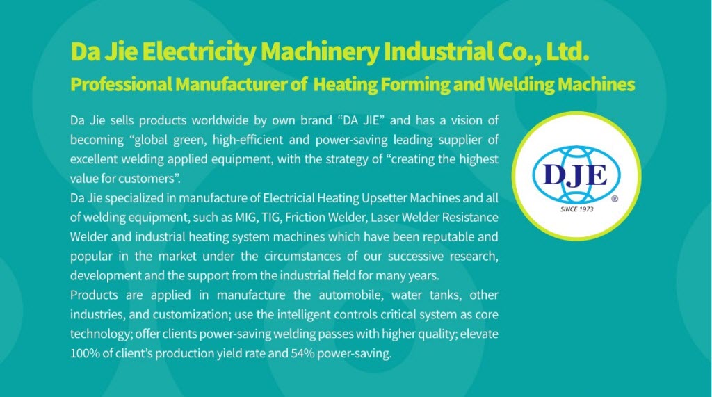 Da Jie là một công ty chuyên kinh doanh sản phẩm máy hàn và gia nhiệt toàn cầu mang thương hiệu “DA JIE”. Tầm nhìn và sứ mệnh của Da Jie là mang đến giá trị cao nhất cho khách hàng và trở thành công ty hàng đầu chuyên cung cấp thiết bị hàn chất lượng có hiệu quả cao, tiết kiệm điện năng và thân thiện với môi trường. Sau nhiều năm nghiên cứu và phát triển, Da Jie đã thành công trong việc sản xuất máy gia nhiệt bằng điện và các thiết bị hàn như MIG, TIG, máy hàn ma sát, máy hàn điện trở laser, cùng với hệ thống máy gia nhiệt uy tín và nổi tiếng trên toàn thị trường. Máy hàn Da Jie được ứng dụng trong lĩnh vực sản xuất ô tô, bồn chứa nước và các ngành công nghiệp khác, sử dụng hệ thống điều khiển thông minh và tạo ra những đường hàn chất lượng cao, đồng thời giúp nâng cao 100% năng suất sản xuất và tiết kiệm 54% điện năng.