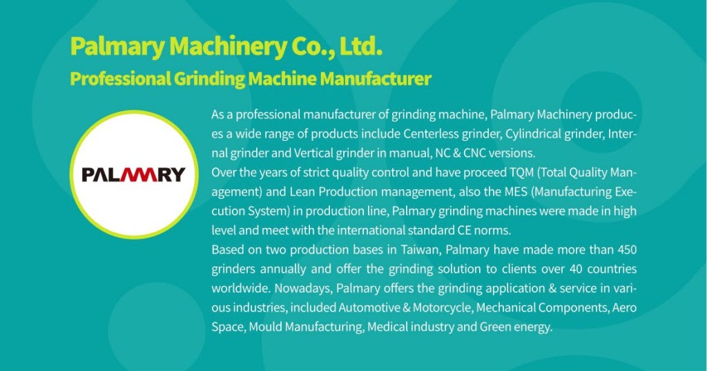 Palmary Machinery là một công ty sản xuất máy mài chuyên nghiệp với nhiều loại sản phẩm khác nhau như máy mài không tâm (Centerless grinder), máy mài trục (Cylindrical grinder), máy mài tròn trong (Internal grinder) và máy mài đứng (Vertical grinder), phiên bản NC và CNC. Trong những năm qua, nhờ quản lý chất lượng nghiêm ngặt và áp dụng quản lý chất lượng toàn diện (Total Quality Management – TQM), quản lý sản xuất tinh gọn cũng như hệ thống vận hành sản xuất (Manufacturing Execution System – MES), các sản phẩm máy mài của Palmary đều đạt chất lượng cao và đáp ứng các tiêu chuẩn quốc tế. Với hai cơ sở sản xuất tại Đài Loan, hàng năm Palmary sản xuất hơn 450 máy mài và cung cấp giải pháp mài cho khách hàng ở hơn 40 quốc gia trên toàn thế giới. Hiện nay, Palmary còn cung cấp dịch vụ cho nhiều ngành công nghiệp khác nhau, bao gồm ô tô và xe máy, linh kiện cơ khí, hàng không, sản xuất khuôn mẫu, ngành công nghiệp y tế và năng lượng xanh.