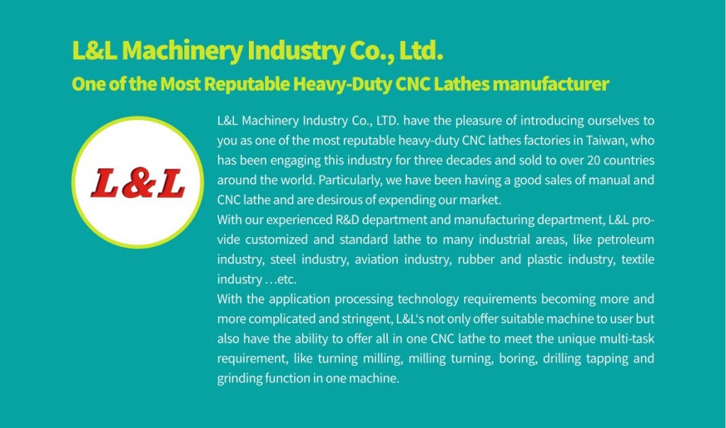 L&L Machinery Industry Co., LTD được đánh giá là một trong những nhà máy sản xuất máy tiện CNC hạng nặng uy tín nhất tại Đài Loan. Công ty đã hoạt động trong ngành công nghiệp này trong 3 thập kỷ và đã bán sản phẩm cho hơn 20 quốc gia trên thế giới. Ngoài ra, L&L Machinery luôn đạt được mức doanh thu cao hàng năm và mong muốn mở rộng thị trường sang các nước khác. Với bộ phận R&D và bộ phận sản xuất nhiều kinh nghiệm, L&L cung cấp máy tiện tiêu chuẩn và tùy chỉnh cho nhiều ngành công nghiệp khác nhau như dầu khí, thép, hàng không, cao su, nhựa, dệt may,… Với những yêu cầu công nghệ xử lý ứng dụng ngày càng trở nên phức tạp và nghiêm ngặt, L&L không chỉ cung cấp máy móc phù hợp với người dùng mà còn cung cấp máy tiện CNC với chức năng “tất cả trong một” để đáp ứng những yêu cầu đa tác vụ riêng như tiện phay, doa, khai thác khoan và mài trong cùng một máy.