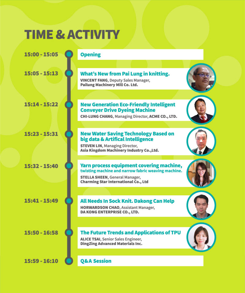 Chủ đề và các công ty tham dự thuyết trình bao gồm: 1. Pailung Machinery Mill Co. Ltd – What’s wew from Pai Lung in knitting 2. ACME Co., Ltd – New generation Eco-friendly intelligent conveyer drive dyeing machine 3. Asia Kingdom Machinery Industry Co.,Ltd – New water saving technology based on big data & Artificial Intelligence 4. Charming Star International Co., Ltd – Yarn process equipment covering machine, twisting machine and narrow fabric weaving machine 5. DA KONG ENTERPRISE Co., Ltd – All needs in sock knit. Dakong can help 6. Ding Zing Advanced Materials Inc – The future trends and applications of TPU