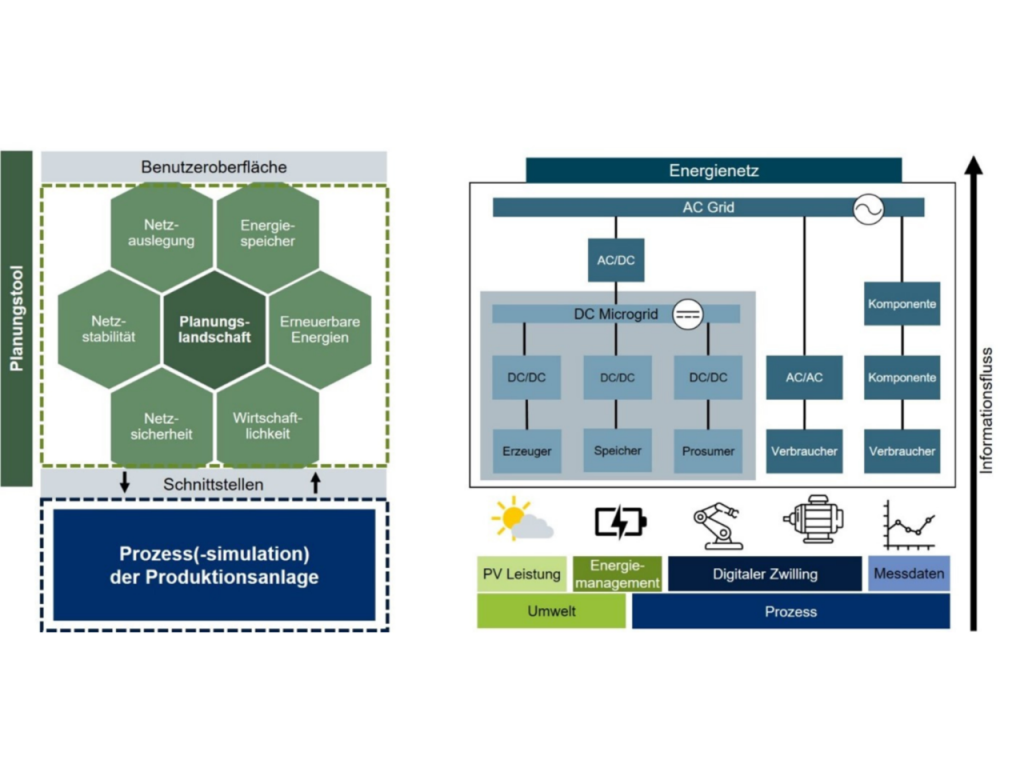 Là một phần của dự án “DC|hyPASim”, đã thắng cuộc trong dự án AiF “Công nghệ hàng đầu cho quá trình chuyển đổi năng lượng”, các nhà nghiên cứu tại viện FAPS (thuộc hiệp hội WGP) đang kiểm tra cách các nhánh dòng điện trực tiếp kết nối với lưới điện công nghiệp, đảm bảo tiết kiệm năng lượng và chi phí. Với mục đích này, các mô hình kỹ thuật số đang được phát triển, dựa trên bản sao kỹ thuật số cũng như sự kết hợp giữa mô phỏng lưới điện DC và nhà máy sản xuất. Công cụ kết quả cho phép các công ty lập kế hoạch, thiết kế và phân tích mạng DC cho hoạt động sản xuất của họ. Các số liệu quan trọng về kinh tế và kỹ thuật được tính toán riêng giúp dễ dàng hơn trong việc quyết định đầu tư vào khoản nào và cách thiết kế mạng cùng các thành phần bảo vệ một cách tối ưu (xem Hình 2).