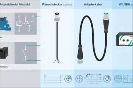 Các tiếp điểm không điện áp được kết nối thông qua một cáp chuyển đổi có tích hợp mạng điện trở, cáp này luôn có sẵn trong kho và có thể được kéo dài đến 10 mét. Một đầu của cáp này được kết nối với bộ điều khiển trung tâm Wilsen.node chạy bằng pin, đầu cáp còn lại được kết nối với tiếp điểm không điện áp, như rơle hoặc công tắc bật tắt đơn giản. Ngoài ra, mạng lưới điện trở cho phép giám sát sự cố đứt dây từ bộ điều khiển trung tâm Wilsen.node đến đầu cáp chuyển đổi.