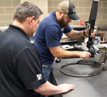 Cánh tay robot đo kiểm tra và thu thập dữ liệu trên một chi tiết đã gia công (một vòng bóng rổ). Dữ liệu này sau đó được phản hồi ngược lại khâu thiết kế và sản xuất, tạo nên một hệ thống khép kín.