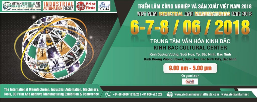Triển lãm Công Nghiệp & Sản Xuất Việt Nam 2018 kết hợp với Triển lãm Tự động hóa công nghiệp 2018 và Triển lãm In & Thiết kế 3D 2018 được tổ chức tại Trung tâm văn hóa Kinh Bắc,Tp Bắc Ninh từ ngày 06 đến ngày 08 tháng 06 năm 2018.