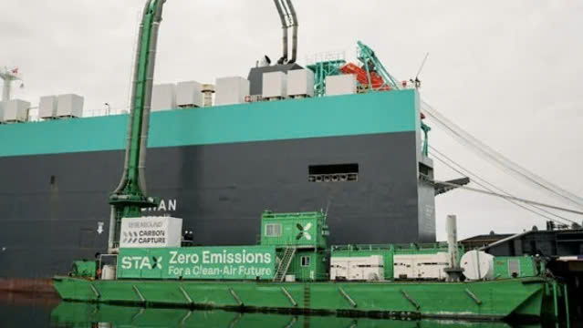 Công ty STAX đặt một xà lan bên cạnh tàu, và một nắp trên phễu để thu khí thải. Công ty sẽ triển khai xà lan thứ tám của mình trong tháng này. Công ty STAX cũng đã công bố khoản tài trợ 70 triệu đô la để thúc đẩy quá trình tích hợp thu khí thải carbon trên toàn đội tàu và mở rộng ra quốc tế trong năm 2025.