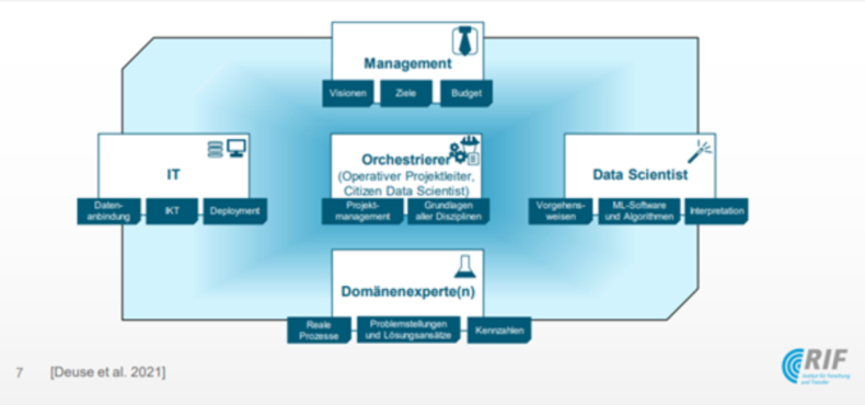 Các câu hỏi liên quan đến tổ chức và trình độ chuyên môn thường được kết nối với nhau. Đối với các công ty người dùng đang tìm cách giới thiệu và vận hành các hệ thống dựa trên thuật toán hoặc AI một cách tự tin, khái niệm vai trò có tầm quan trọng đáng kể. Khái niệm này xác định ai sẽ điều phối toàn bộ phần giới thiệu, sở hữu chuyên môn toàn diện về CNTT và khoa học dữ liệu, sở hữu kiến thức về khu vực hoạt động để quyết định các phương pháp CNTT phù hợp và giám sát sáng kiến từ cấp quản lý. Mỗi vai trò đòi hỏi các nhiệm vụ, trách nhiệm và yêu cầu năng lực cụ thể. Ông René Wöstmann, cộng tác với các đồng nghiệp từ Đại học TU Dortmund và Viện Nghiên cứu và Chuyển giao RIF, đã trình bày khái niệm vai trò bao gồm tất cả các mô-đun trình độ cần thiết, được thiết kế riêng cho các doanh nghiệp vừa và nhỏ.