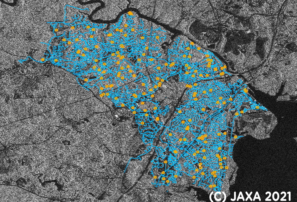 Đường màu xanh lam hiển thị đường ống dẫn nước. Các chấm màu vàng là “điểm cần quan tâm” – nơi dữ liệu vệ tinh cho thấy có rò rỉ nước