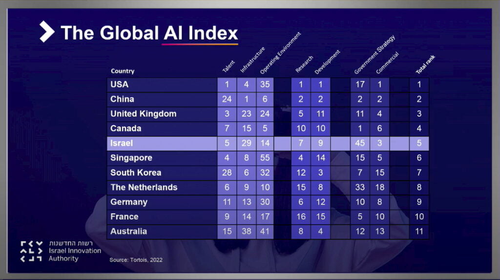 Theo trang tin tức Tortoise Media tại Anh, cho rằng Israel một quốc gia nhỏ bé, hiện đứng thứ năm trên thế giới trong bảng xếp hạng các quốc gia hàng đầu về đầu tư, đổi mới và triển khai trí tuệ nhân tạo AI, chỉ sau Mỹ, Trung Quốc, Anh và Canada.