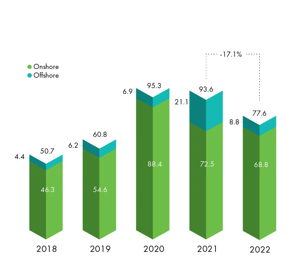 Năm 2022, toàn cầu có 77,6 GW công suất điện gió đã được kết nối vào lưới điện, nâng tổng công suất gió lắp đặt lên 906 GW1, tăng trưởng 9% so với năm 2021.