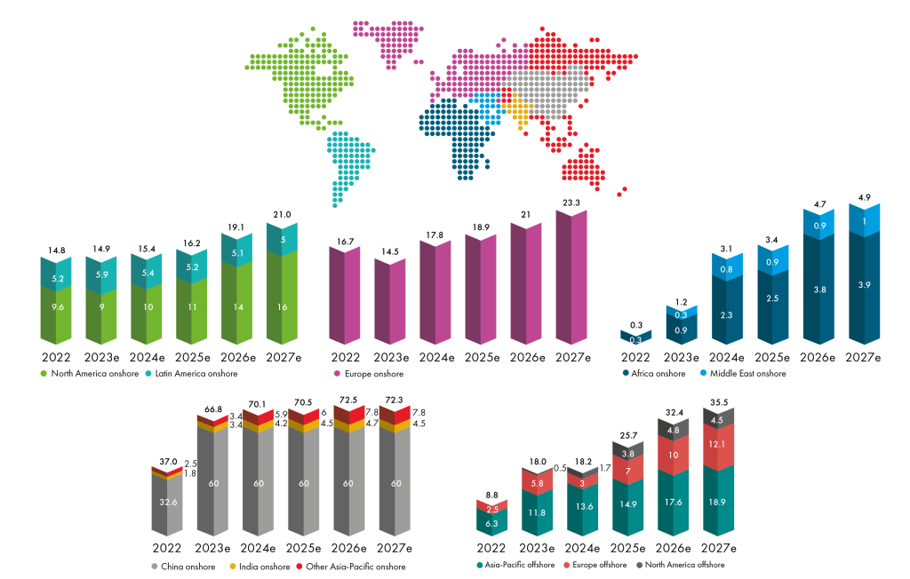 Dự báo công suất mới sẽ đạt là 680 GW trong 5 năm tới (2023-2027). Con số này tương ứng với 136 GW điện gió mỗi năm cho đến năm 2027.