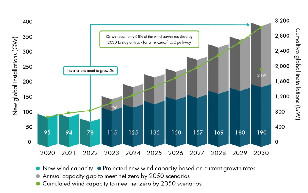 Cột mốc 2.000 GW công suất điện gió dự kiến sẽ đạt được chỉ sau 7 năm So với triển vọng toàn cầu năm 2030 được công bố cùng với báo cáo gió toàn cầu năm ngoái, Bản tin thị trường GWEC đã tăng dự báo về tổng công suất điện gió khai thác trong giai đoạn 2023–2030 lên 143 GW (13% hàng năm).