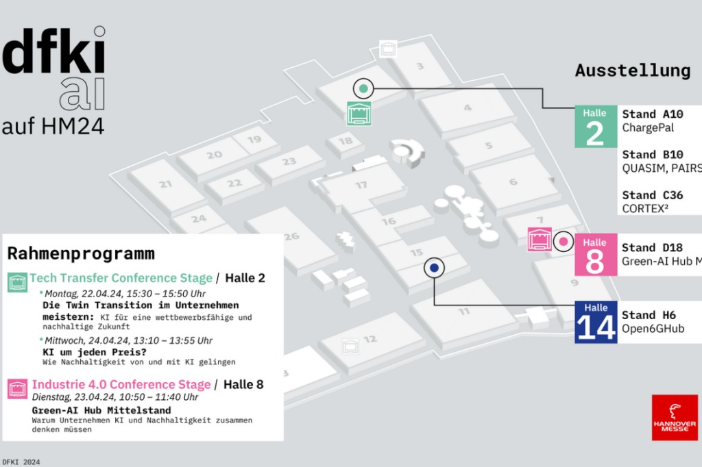 Trung tâm DFKI sẽ giới thiệu các giải pháp công nghệ AI cho nền kinh tế bền vững tại một số sảnh của hội chợ Hannover Messe. Các chương trình hội thảo và thuyết trình có sự góp mặt của các chuyên gia công nghệ trí tuệ nhân tạo từ trung tâm DFKI.