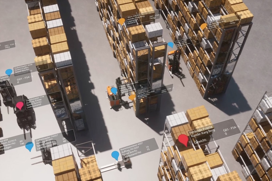 Một hình ảnh động thực tế – trong thời gian thực Pallet mà tôi đang tìm, nó ở đâu trong kho? Trong kho của mình, tôi còn bao nhiêu vị trí trống để lưu trữ? Những câu hỏi này và những câu hỏi tương tự phát sinh trong thực tế hàng ngày, đặc biệt là khi các hoạt động thủ công dần làm sai lệch dữ liệu trong hệ thống quản lý kho. Theo công ty Google, tính minh bạch trong kho và nhà máy sản xuất chỉ có thể đạt được bằng cách sử dụng bản đồ kỹ thuật số, ghi lại và hiển thị vị trí của các đối tượng và khu vực bằng kỹ thuật số song sinh theo thời gian thực. Giải pháp này đặc biệt có lợi về mặt kinh tế nếu dữ liệu cần thiết được thu thập một cách tự động. Do đó, dự án nghiên cứu ARIBIC cũng đã điều tra câu hỏi về cách thức triển khai quy trình tự động như vậy để thu thập trạng thái và dữ liệu. Ông Dennis Schüthe, Giám đốc dự án tại công ty STILL, nói rằng: “Chúng tôi đã thu thập dữ liệu cần thiết cho kỹ thuật số song sinh thông qua thiết lập cảm biến trong xe tải công nghiệp, mô phỏng các cảm biến sẽ được tích hợp trong tương lai. Sau đó, dữ liệu này được kết hợp thành thông tin kỹ thuật số của môi trường, chuyển lên đám mây và bổ sung thông tin ngữ nghĩa. Tại đó, kho có thể được so sánh với hệ thống quản lý kho và có thể tự động xác định sự khác biệt”. Bản đồ này cung cấp thông tin trực tiếp về kho hàng, vì xe tải công nghiệp liên tục di chuyển và cập nhật bản đồ theo thời gian thực. Điều này tạo ra 3D kỹ thuật số song sinh động, giúp giảm khối lượng công việc và tăng lượng dữ liệu.
