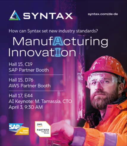 Công ty Syntax có trụ sở tại vùng Weinheim (phía tây bắc Baden-Württemberg, CHLB Đức), là doanh nghiệp cung cấp dịch vụ công nghệ thông tin (CNTT) toàn cầu và dịch vụ đám mây. Tại hội chợ Hannover Messe 2025 – gian hàng đối tác của SAP (hall 15, stand C19) và công ty AWS (hall 15, stand D76) – công ty Syntax sẽ trình bày những khả năng mà công nghệ AI mang lại cho các doanh nghiệp sản xuất quy mô vừa. Đó là những giải pháp đã được kiểm nghiệm kết hợp với công nghệ trí tuệ nhân tạo tạo sinh (GenAI), cùng các quy trình sản xuất đã được chứng minh.