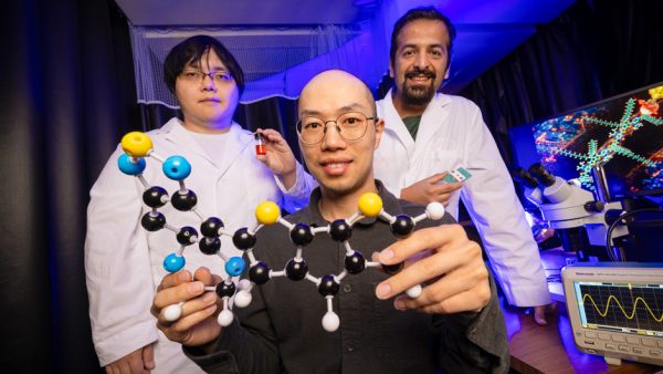 Từ trái sang: Sinh viên Shaocheng Shen, Trợ lý Giáo sư Kun Wang và sinh viên Mehrdad Shiri với phân tử của họ và mô hình hóa học