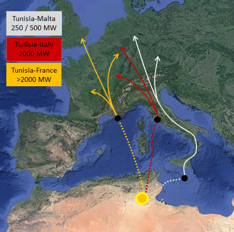Từ lâu châu Âu đã muốn dần “cai” dùng nhiên liệu hóa thạch và chuyển sang các nguồn năng lượng có thể tái tạo như gió hoặc mặt trời. Tuy nhiên nhiều nơi tại đây vẫn không có điều kiện tự nhiên phù hợp với năng lượng mặt trời. Do đó, họ đang muốn xây một cánh đồng năng lượng mặt trời tại sa mạc Sahara, Tunisia với khả năng tạo ra 4.5 gigawatt điện, sau đó dưa trở về châu Âu bằng hệ thống cáp ngầm dưới biển.